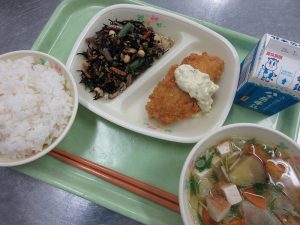 献立は、ごはん ホッケのフライ(タルタルソース) ひじきの炒め煮 ごまみそ汁 牛乳でした。