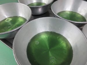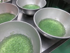 まず、メロンソーダゼリーをつくります。固まったらつぶして「ジュレ」にします。フルーツを入れて仕上げました。