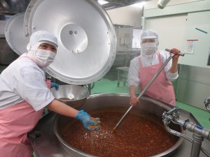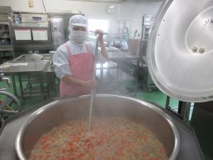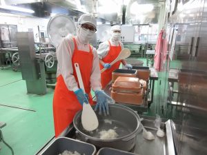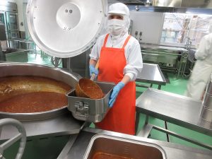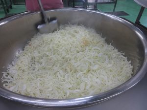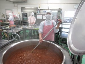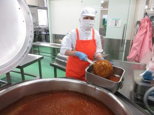「ハヤシライス」の玉ねぎです。今日は27㎏の玉ねぎを使いました。甘みが出るまでじっくり炒めます。