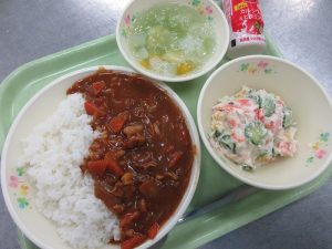 献立は、ハヤシライス ポテトサラダ フルーツポンチジュレ ジョア(ストロベリー味)でした。