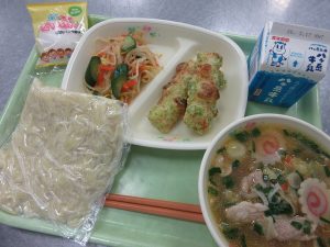 献立は、しょうゆラーメン ちくわの磯辺揚げ きゅうりともやしの漬物 バニラ大福 牛乳でした。