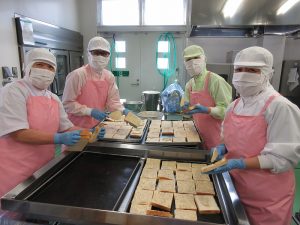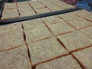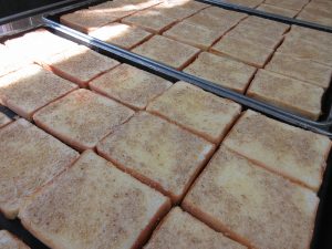 「セサミトースト」です。さとうと白ごまを混ぜたマーガリンを食パンにぬっていきます。表面全体をまんべんなく丁寧にぬりました。