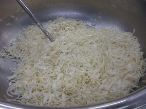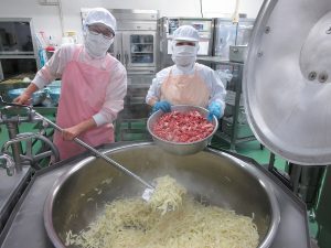 「ポークチャップ」は、日本で生まれた洋食メニューです。まず、たくさんの玉ねぎを歯ごたえが残るように炒めます。そして豚肉を加えてふっくらと炒めます。