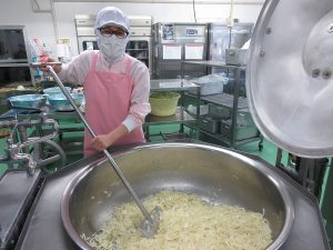 今日の給食は、パンにもごはんにも合う「ポークチャップ」です。