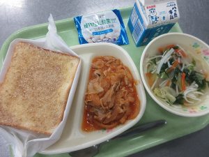 献立は、セサミトースト ポークチャップ ジュリエンヌスープ ヨーグルトレーズン 牛乳でした。