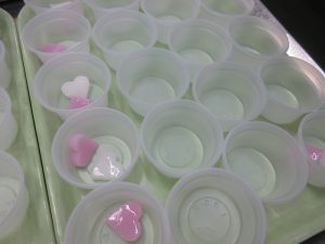 カップにハートの杏仁豆腐を入れて、青りんごゼリー液を注いでつくりました。