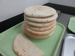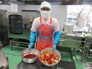 6年2組は、主食を「ケバブ」、主菜は「ヤンニョムチキン」、副菜は「ポテトサラダ」の希望献立でした。トルコ料理を代表するケバブですが、日本の屋台などでよく見るのは、お肉を回転させながら焼いて、そのお肉を薄く削り落としてピタパンと一緒に食べる「ドネルケバブ」です。給食での調理は難しいので、ピタパンに「ヤンニョムチキン」と「ポテトサラダ」をはさんで食べるようにしました。