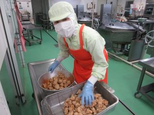 「ヤンニョムチキン」です。鶏もも肉に下味をつけて、かたくり粉をまぶします。