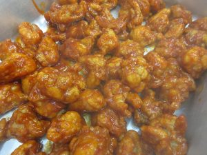 揚げた鶏肉にからめます。まんべんなく上手にからまりました!