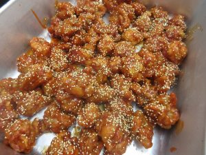 白ごまをふって完成です。「ヤンニョムチキン」は、韓国の人気料理です。