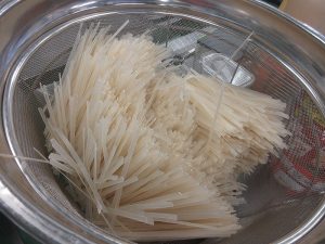 平たい米粉麺の「フォー」はさっとゆでて、スープに入れます。ねぎとにらを入れたら完成です!