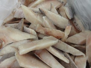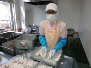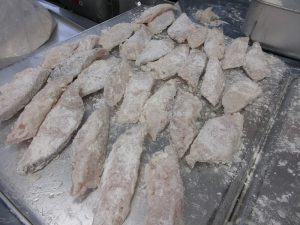 「白身魚のレモン煮」です。メルルーサに下味をつけて粉をまぶします。身がやわらかいので、丁寧に粉をつけました。