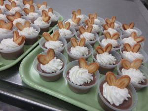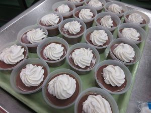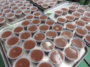 「卒業お祝いデザート」です。牛乳を沸騰しない温度にあたため、ココアプリンを作ります。