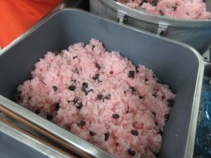 お祝いの「お赤飯」です。春色に色づきました。甘納豆を入れた甘いお赤飯です。