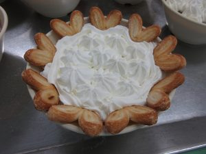固まったら、ホイップをしぼります。上にハートのパイを飾ったら完成です!