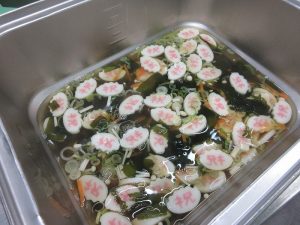 「すまし汁」の中に、お祝いかまぼこが入っています。
