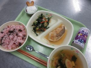 献立は、お赤飯(ごま塩) 白身魚のレモン煮 ほうれん草のごま和え すまし汁 卒業お祝いデザート ジョア(ブルーベリー)でした。