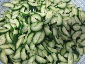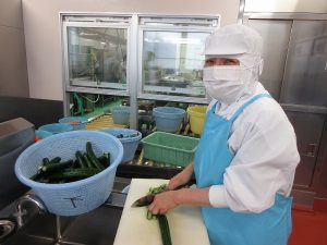 「きゅうりともずくの和え物」です。山梨県産の新鮮なきゅうりを斜め切りにします。