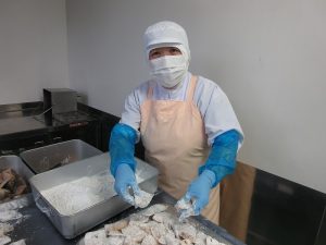 「ホッケの竜田揚げ」です。下味をつけて、かたくり粉をまぶします。