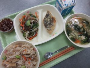 献立は、鶏ごぼうごはん ホッケの竜田揚げ きゅうりともずくの和え物 みぞれ汁 カフェオレゼリー 牛乳 でした。