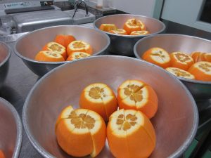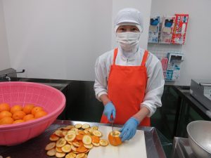 今日のデザートの果物は「オレンジ」です。