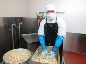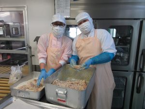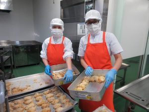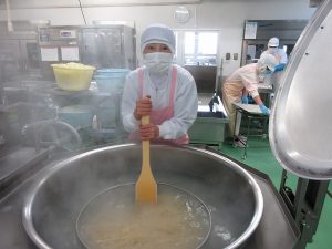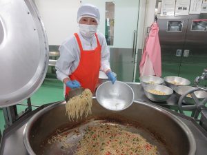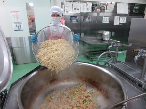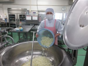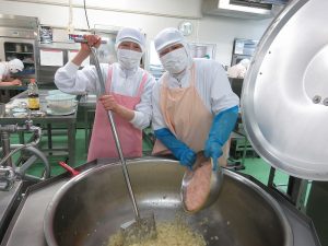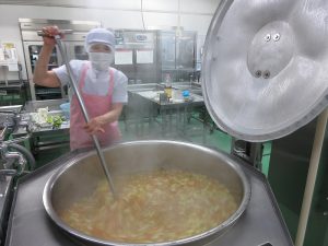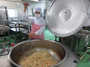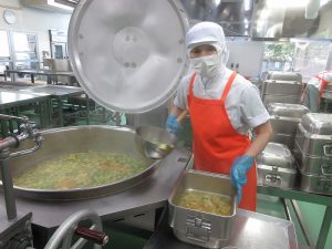 給食室では、料理の彩りも大切にしながら、目でもおいしさを伝えられるように心がけています。