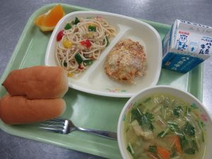 今日の給食は、パンに合わせた洋食メニューです。