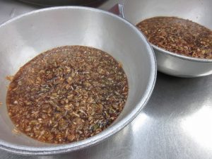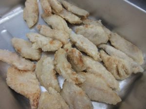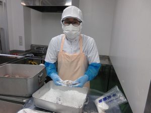 下味をつけた魚に粉をまぶします。身が割れやすいですが、上手に粉をつけて、揚げてくれました。