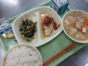 献立は、ごはん 白身魚のねぎソースかけ ほうれん草のごま和え 豚汁 ミニオムレット 牛乳でした。