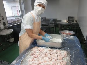 「鶏肉のチリソースかけ」です。下味をつけた鶏もも肉にかたくり粉をまぶして、カラリと揚げます。