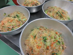 もどした「春雨」に味をすわせて、彩りに小松菜を入れたら完成です。ふわふわの「チャプチェ」になりました!