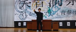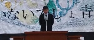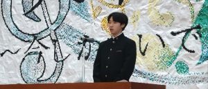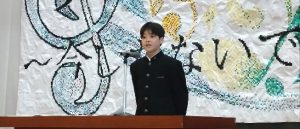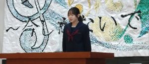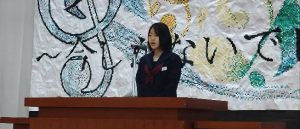 1年代表藤本さん、2年代表志村さん、3年代表小林さん、新生徒会代表村山さんが発表しました。