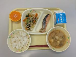 麦ごはん・牛乳・鮭の塩焼き・小松菜の和え物・豚汁・ぽんかん