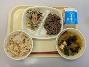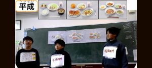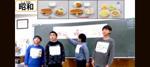 また、この日には給食委員会が作成した「給食の昔と今」についての動画を各クラスで視聴しました。給食が始まった頃から、昭和、平成、令和と給食がどのように変化したのかを劇にして動画を作成しました。