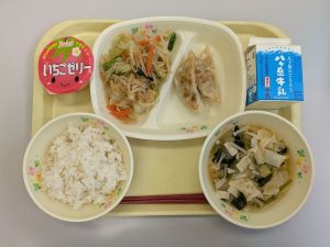麦ごはん・牛乳・焼き餃子・かんぴょうのごま和え・ゆばのみそ汁・いちごゼリー