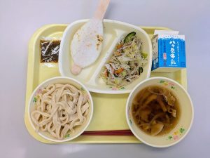 武蔵野うどん・牛乳・ゆかり和え・五平餅