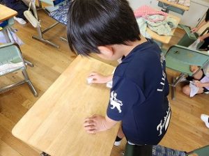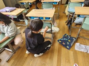 2組では、まず、自分が使う机といすをピカピカにしました。
