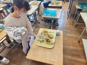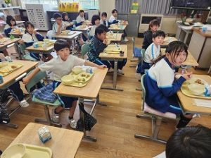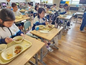 給食スタート 2026年04月13日 新年度の給食が始まりました。 新しいクラスになっているので、ルールを確認しながらの配膳となりました。 今までの経験をもとに、協力して取り組んでいる姿が見られました。 好き嫌いなく、たくさん食べて成長していってほしいと思います。 3年生