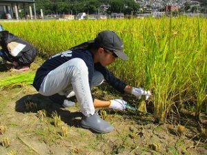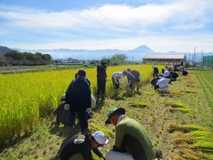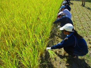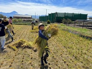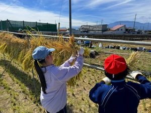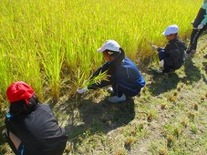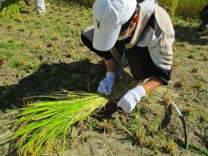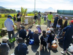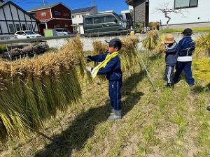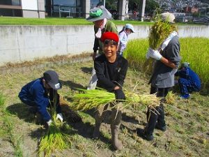 10月8日(水)に5年生が稲刈りを体験しました。これは農業を学習する一環として稲刈りを体験するもので、「おやじの会」の協力で、「稲刈り」と「稲を干す」作業を体験しました。初めて稲刈りを体験する5年生も多く、収穫の大変さを体験し、農業についての理解を深めました.
