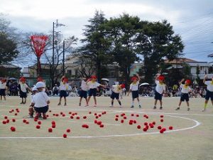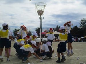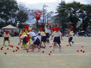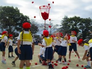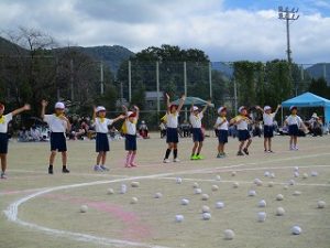 運動会⑥ ダンシング玉入れ(1年) 2025年10月16日 運動会6番目は、1年生の「ダンシング玉入れ」です。「バナナくん体操」の曲に合わせて楽しく踊りました。曲が変わると「玉入れ」になり、熱戦の結果、かごの中の玉の数はなんと同じ数になり、仲良く引き分けました。 学校からのお知らせ