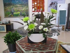 今回の生け花は、アナスタシア(菊)、吾亦紅(ワレモコウ)、スプレー菊(白)、ドラセナ(赤葉)です。吾亦紅(ワレモコウ)は「私も赤い」意味に由来し、ドラセナは「真実の木」と呼ばれています。花言葉は、アナスタシアが「高貴・高潔」、吾亦紅が「変化・もの思い」、スプレー菊が「真実・高潔」、ドラセナが「幸福・永遠の愛」になります。
