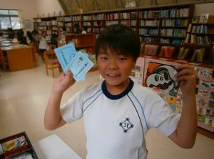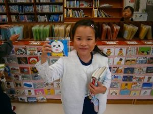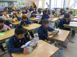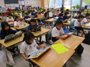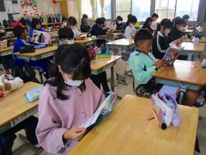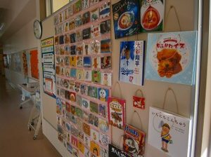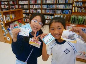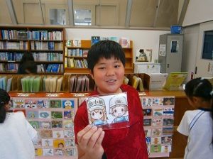 10月20日(月)から10月31日(金)までの12日間は校内読書週間です。読書の秋にちなんで、たくさんの本に親しめるように、お薦めの本の紹介や「本でビンゴ」などのイベントを行っています。本の分類番号がそのままビンゴの数字となり、たくさん本を借りると列の数字がそろうと景品をゲットすることができます。司書の先生が手作りした本の表紙絵がデザインされた本ケースや優待券を手に入れようと、様々な分野の本を借りに図書室も大盛況です。どのクラスも朝読書の時間には集中して読書に取り組んでいました。