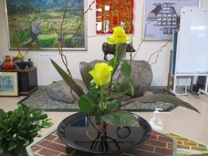 今回の生け花は、雲竜柳、黄バラ、ドラセナ(葉)になります。花言葉は、雲竜柳が「素早い対応」、黄バラが「友情・幸福」、ドラセナが「幸福な交際」です。来年3月に千秋楽を迎える劇団四季ミュージカル「美女と野獣」に登場する「魔法のバラ」に負けないくらい美しい「ベルのドレスと同じ色のバラ」に子どもたちも思わず「ビジュいいね」とつぶやいていました。