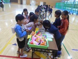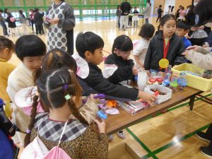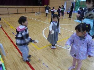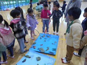 11月14日(木)敷島保育園の年長さんとの交流会をしました。秋の自然物を使って、どんぐりごまや松ぼっくりのけん玉などの遊び道具を作り、お店屋さんを開きました。みんなでじゃんけんゲーム(貨物列車)をしたり、一緒にお店屋さんを回ったりして仲よくなることができました。