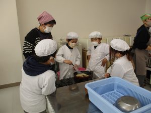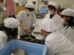 12月12日、きなこ作りの調理実習を行いました。今回は講師として給食センターの雨宮先生をお招きし、国語科「すがたをかえる大豆」の学習で扱った大豆を使って、実際にきなこ作りに挑戦しました。