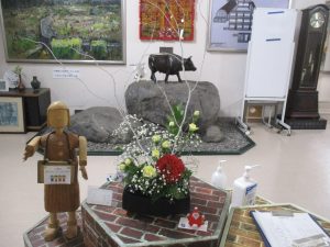 今回は12月なのでクリスマスアレンジになります。白木、ダリア(赤)、ルスカス(葉)、スプレーカーネーション(黄)、かすみ草(白)でクリスマスの雰囲気が伝わります。花言葉は、ダリアが「華麗・栄華」、ルスカスが「陽気・純愛」、スプレーカーネーションが「友情・美」、かすみ草が「幸福・感謝」になります。