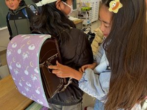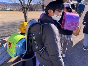 山梨県PTA親子安全会から児童生徒の安全対策として補助金をいただきました。本校では「クマ鈴」を購入し、全校児童すべてに配付しました。ランドセルに取り付け、チリンチリンと音がすることでクマ等による被害を防ぎます。消音機能があるので音が気になる場面ではならないようにもできる優れものでした。普段の集団登校では音が響き合って防犯意識も高まったようでした。