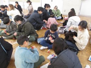 何も書かれていないこまに思い思いの色をつけ、牛乳パックを使ってビュンビュンごまを作りました。親子で相談しながら工夫する姿や、回ったときの色の広がりを楽しむ様子が見られ、教室は温かい雰囲気に包まれました。