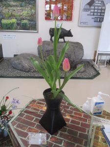 今回の生け花はチューリップです。チューリップの花言葉は「愛の芽生え」「誠実な愛」です。春の訪れが近いことを感じさせてくれます。