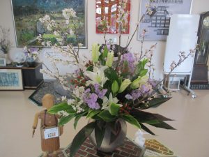卒業式に向け、職員玄関の生け花が豪華な卒業バージョンに変わりました。早咲きの桜が春の訪れを告げるようでした。